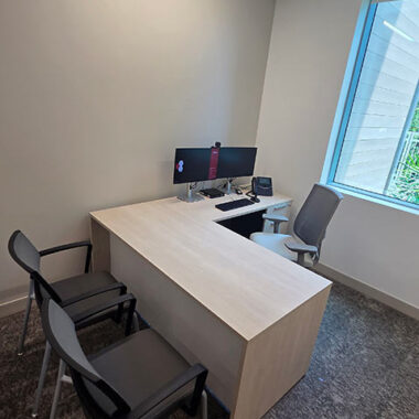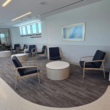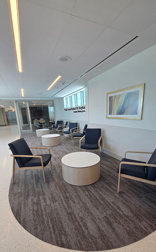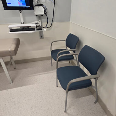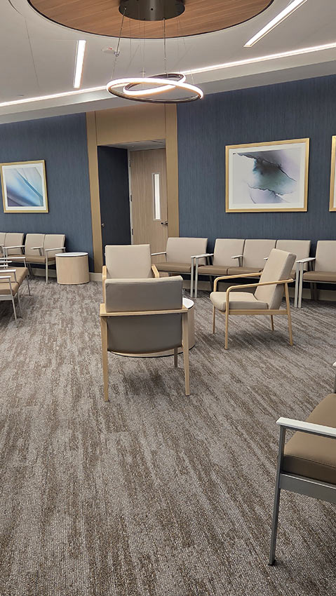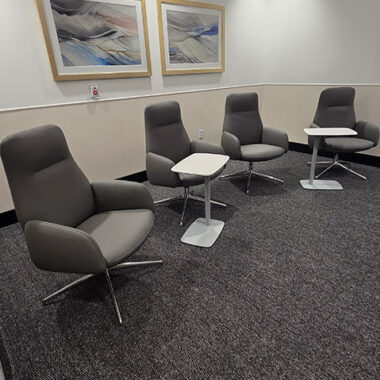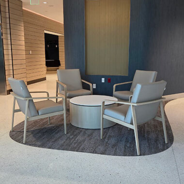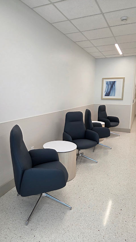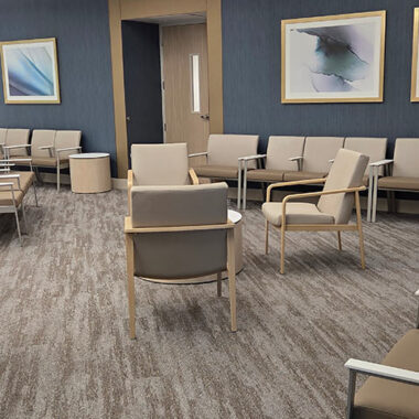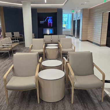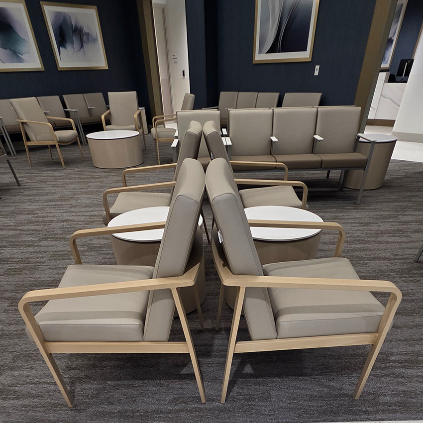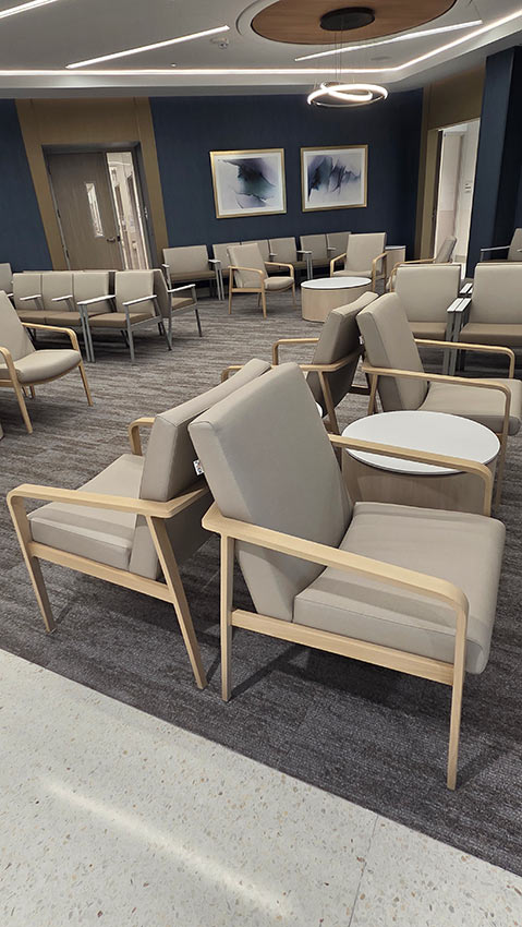 The space was designed to create a welcoming and comfortable experience for patients, visitors, and staff. In the lobby, the IOA Viggo chairs and loveseats offer an inviting respite amidst the busy facility. The Viggo collection from IOA offers a full family of seating, including armchairs, loveseats, high-back and hip chairs in wood and metal finishes.